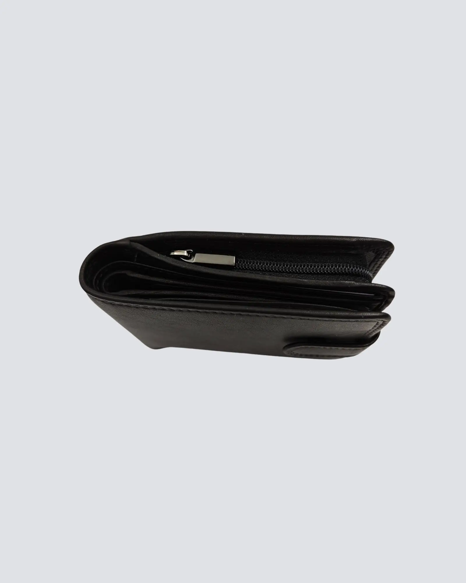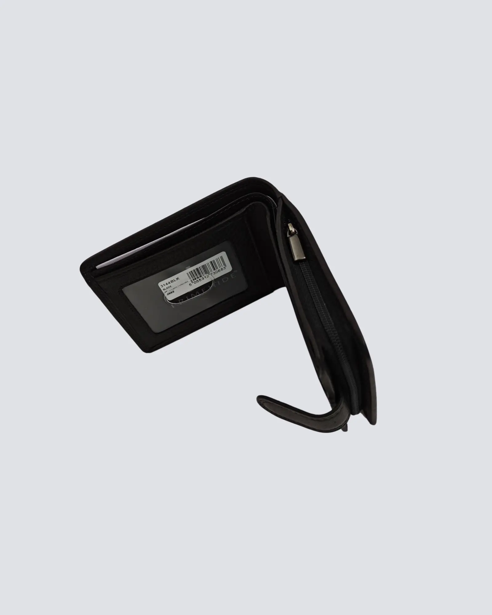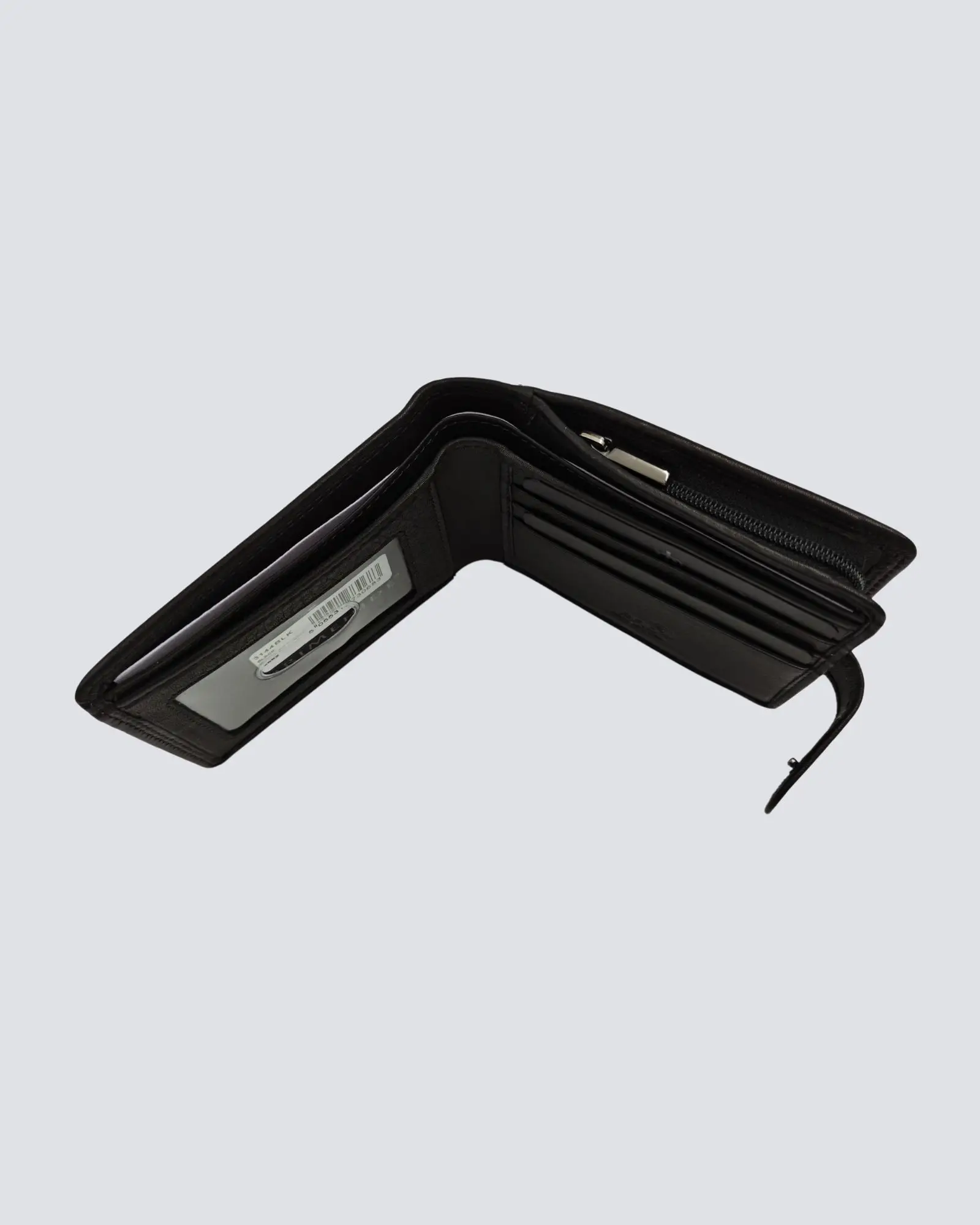 Vrlo praktičan novčanik sa dve pregrade za papirni novac, prostorom za 4 kartice kao i dodatan prostor sa providnim odeljkom za dokument, takodje ima i poseban deo za sitan novac koji se zatvara ziperom. Crne je boje i ima sigurnosnu kopču za zatvaranje.